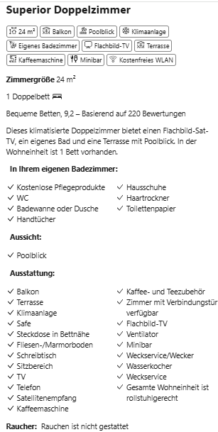 Jedes Superior-Doppelzimmer umfasst 22 Quadratmeter Wohnfläche sowie eine private Terrasse von 6 Quadratmetern, ideal, um die frische Inselbrise und die herrliche Aussicht zu genießen.