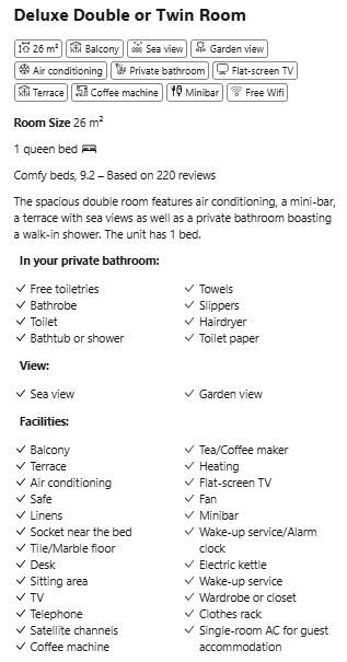 Each Deluxe Double Room spans 24 m² and features an additional 6.5 m² private terrace, providing a serene outdoor space to relax.